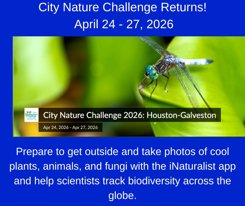 Join CEC in the 2026 City Nature Challenge, a global community science event! Organize your own event with your school, place of worship, scout troop or friends in the Houston, Galveston, Fort Bend and surrounding countries or participate in one of the many events around town.